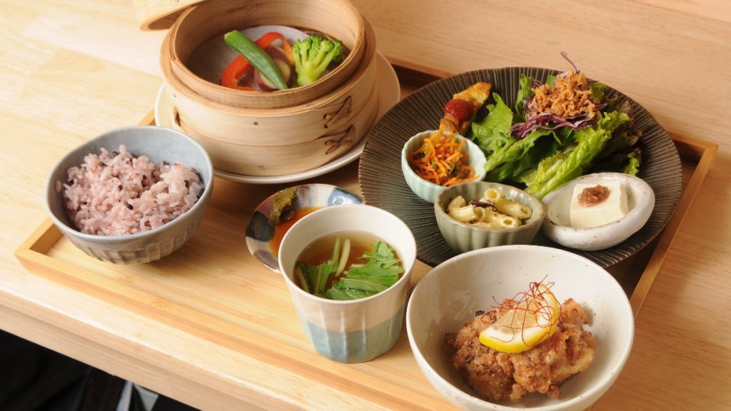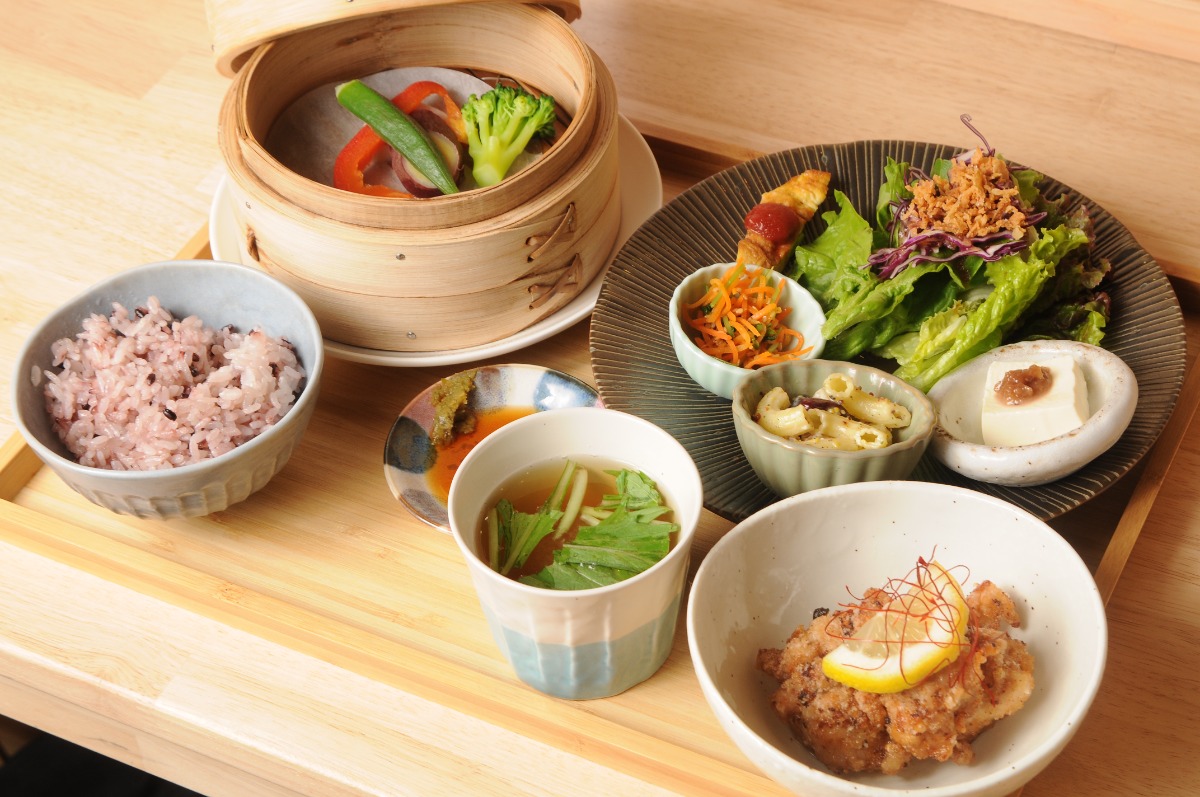 日替わりランチは、メインと3種の副菜、スープ、ごはん、サラダ、蒸し野菜と豪華なラインナップに。