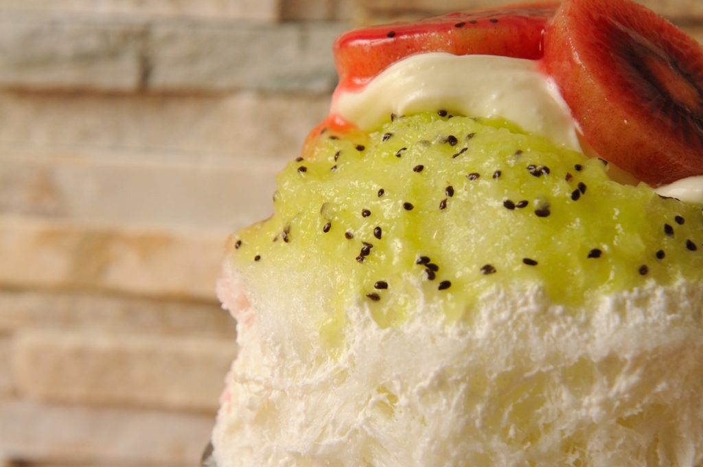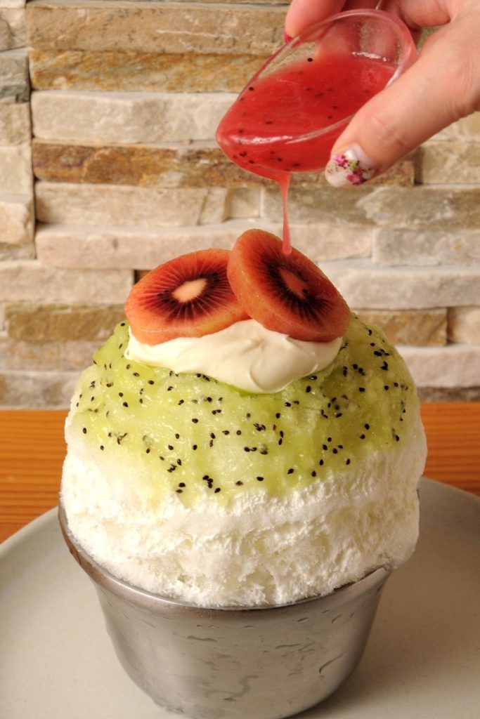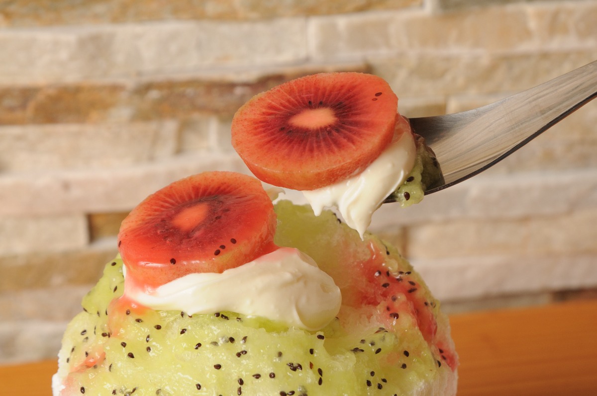 グリーン・ゴールデン・ルビーレッド3種類のキウイを使ったかき氷は、見ているだけで涼しさを感じる。