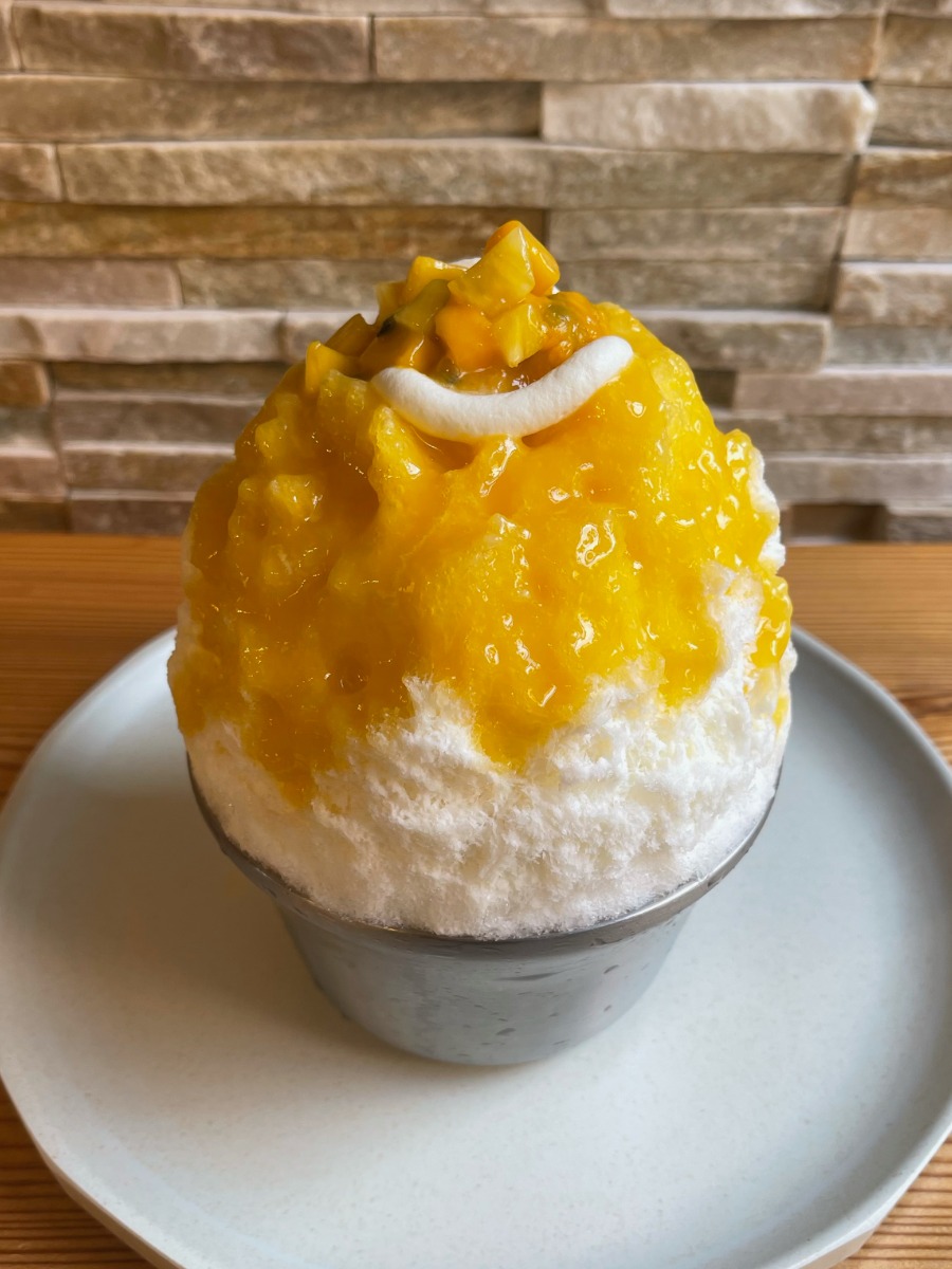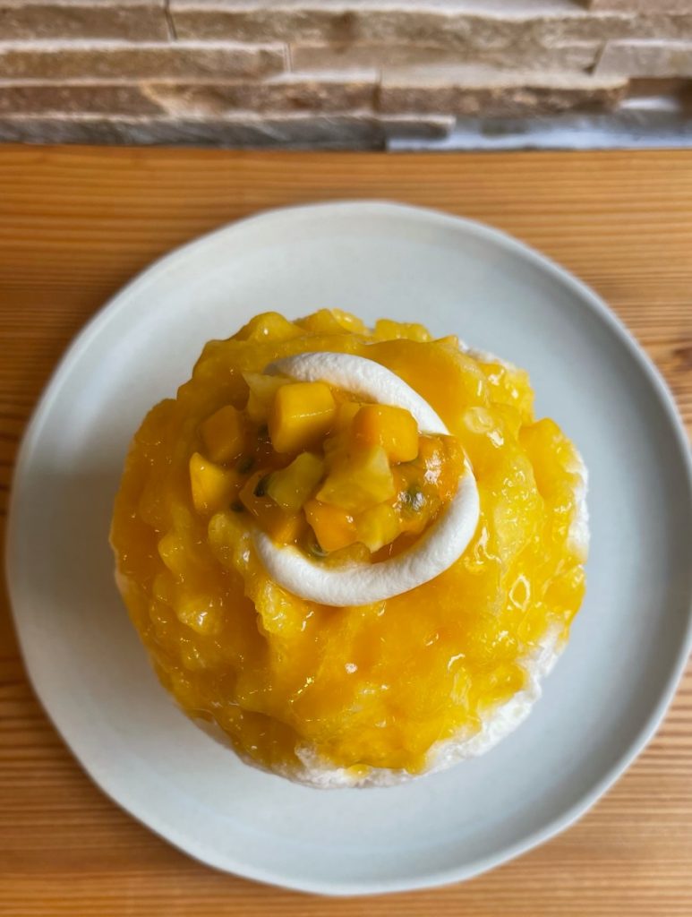 さわやかな甘みの杏仁ミルクシロップに加え、パッションフルーツ、パイナップル、マンゴーの果肉を刻んで作ったタルタルがトロピカルな風味を演出する。