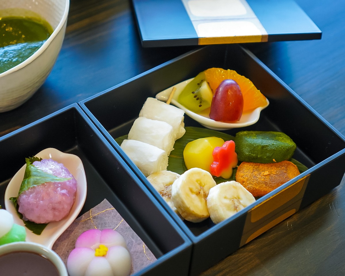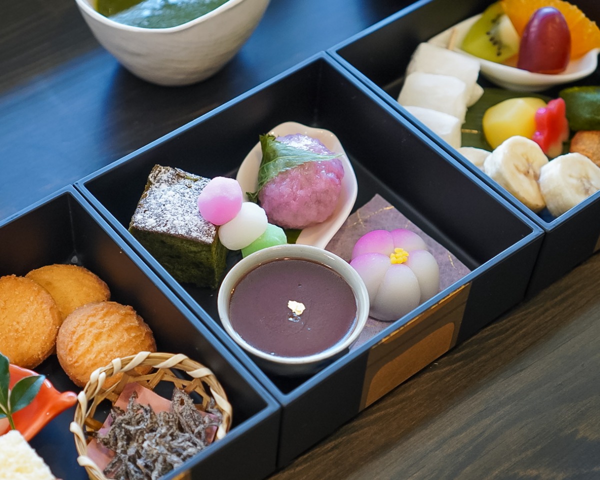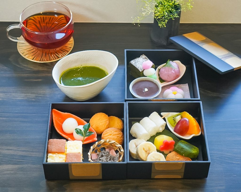 3段のお重に和菓子やフルーツが盛り付けられた人気メニューです。