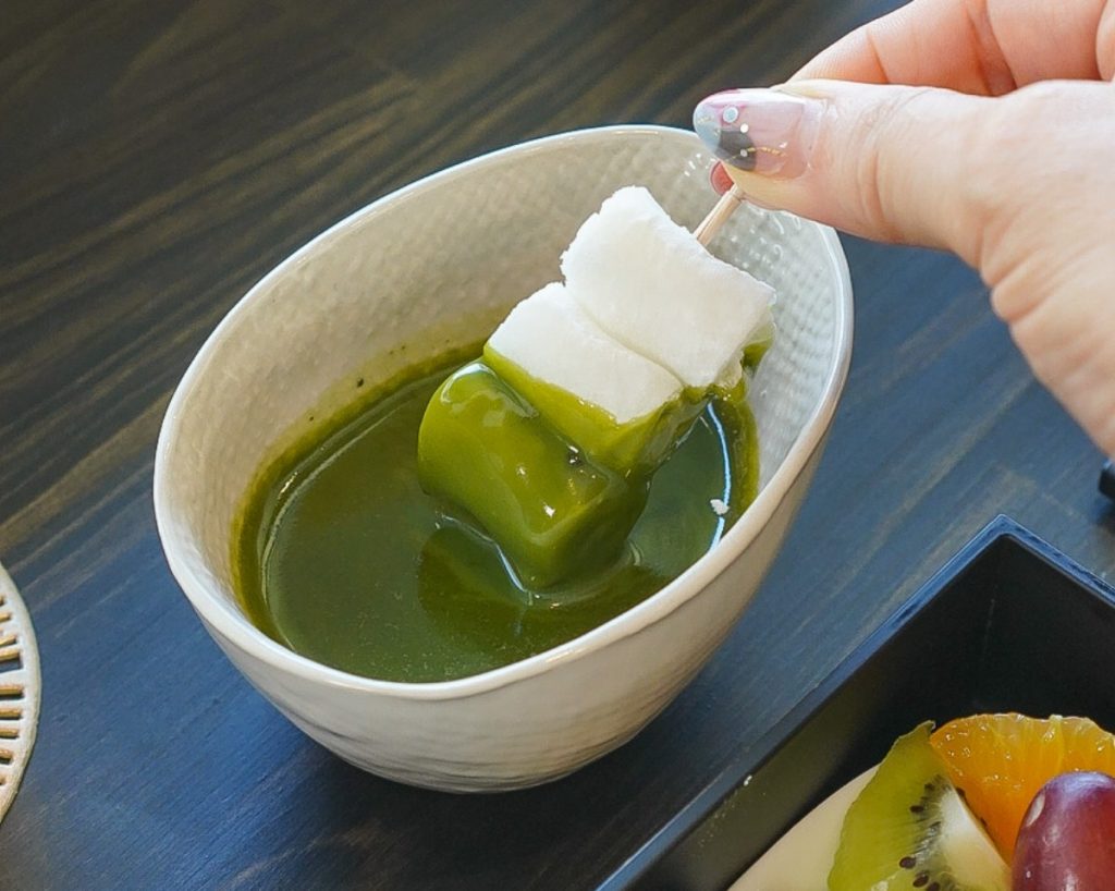カンナ特製の抹茶チョコソースは深い甘さで、大和茶の味わいで後口もスッキリした抹茶フォンデュです。俵型のお団子に見えますが、じつは細長い求肥をくるくるとお団子状に巻いてあるんです。つまんで食べやすいように工夫してあるお店の心遣いが嬉しいですね。