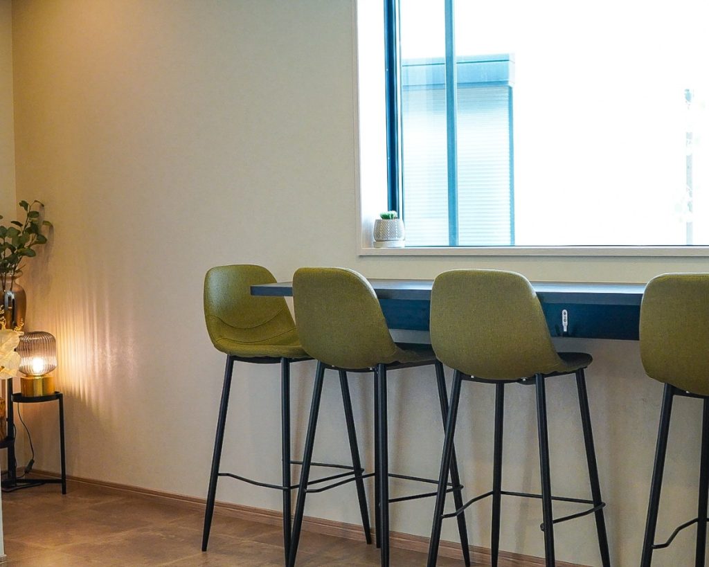 店内は明るい陽射しが差し込むカウンター席、ゆったりできるテーブル席と広々とした空間です。