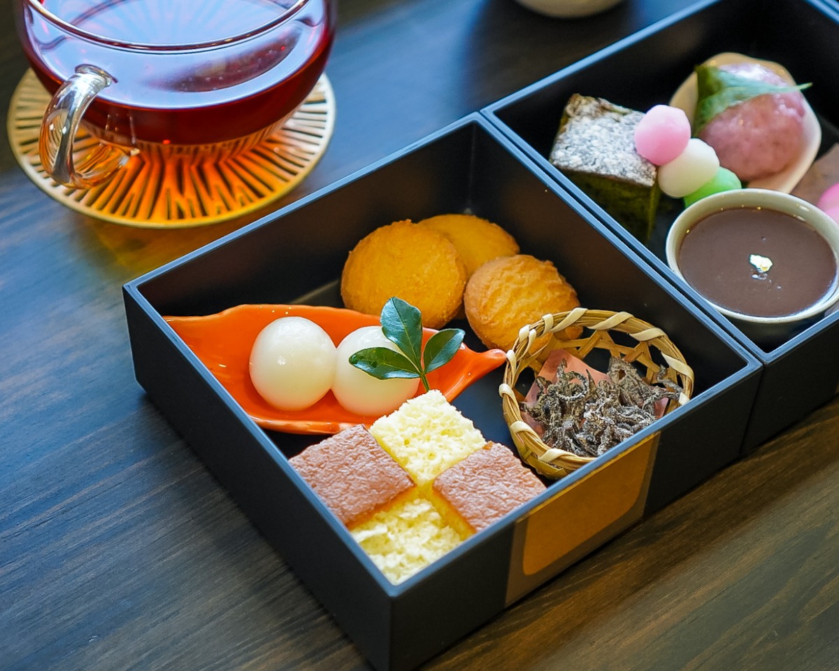 和モダンなお重、ふたを開けると和スイーツがみっしり!一口サイズなので、きゅんとするほど可愛いです。