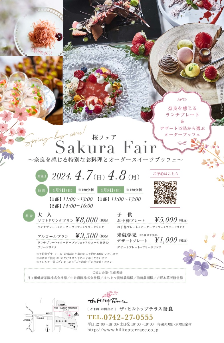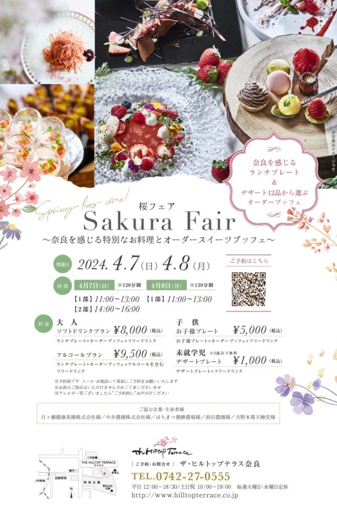 「ザ・ヒルトップテラス奈良」(奈良市)では、4月7日(日)、8日(月)の2日間限定で『桜フェア – Sakura Fair –』を開催する。