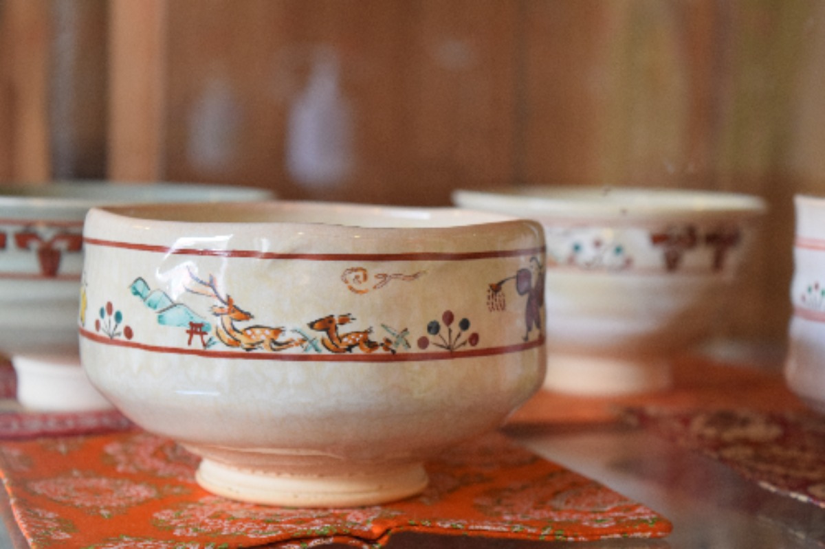 『ならまち招福庵』では自分で選んだお茶碗で、点ててすぐの抹茶を飲むことができる。 こちらの茶碗は赤膚焼の窯元、大塩玉泉さんに作ってもらったもの。