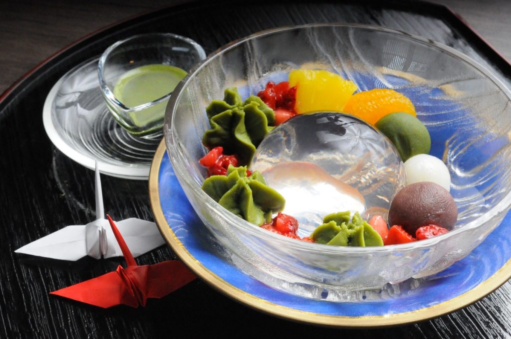 ゼリーの周りには、赤こしあん、白玉、フルーツの他に、自然栽培で育った大和茶の抹茶を使った抹茶あんこと抹茶あんこクリームがあしらわれている。