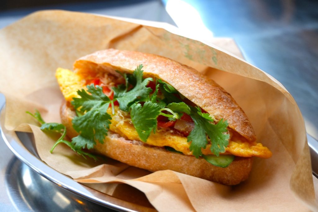 近くの人気パン屋さんで特注で作ってもらっているというバインミー専用バゲットに、自家製のレバーパテ、野菜のピクルス、オーダーが通ってから焼くふわふわの玉子焼きを挟んだバインミー。