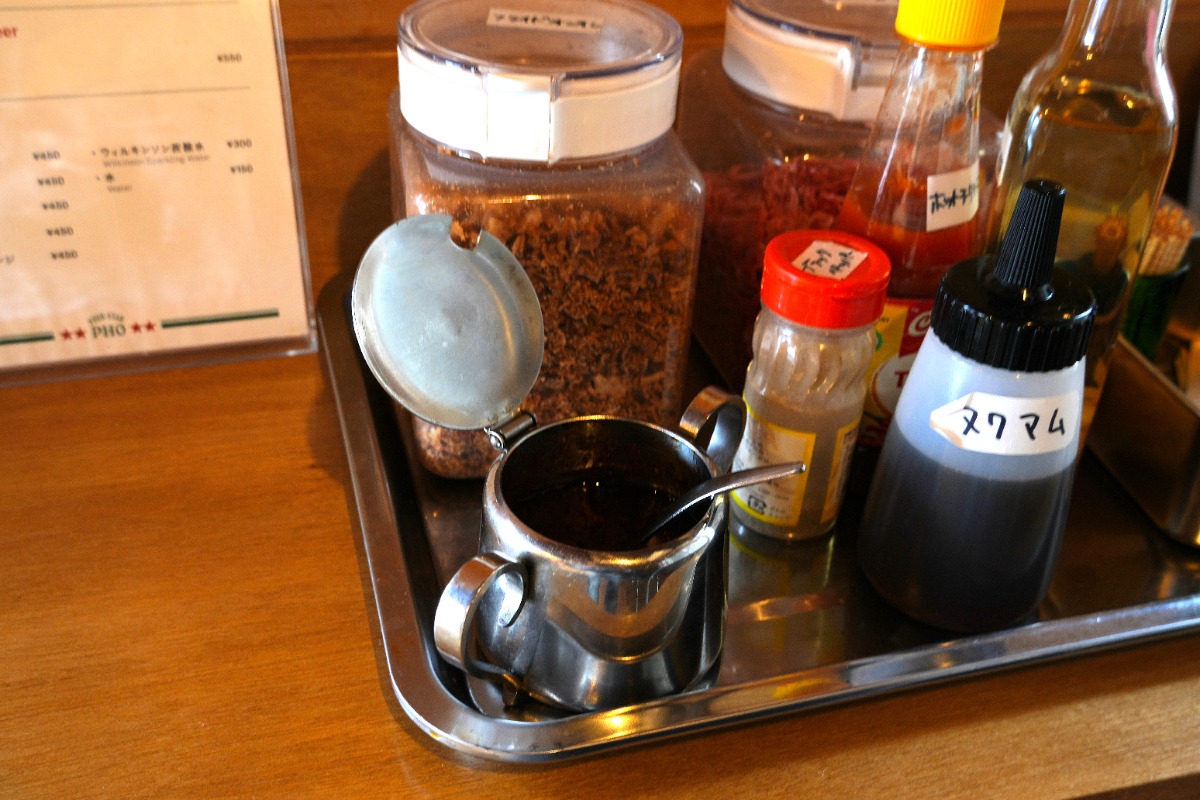 魚醤(ヌクマム)や辛エビ味噌、干しエビ、フライドオニオンなど、卓上のトッピング・味変アイテムも豊富。