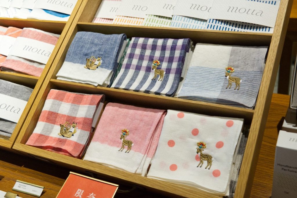 正倉院宝物に描かれる吉祥の象徴とされる「霊獣」、頭に大きな花のような角をつけた「花鹿」や、季節限定のもの、イニシャルなどを刺繍して、オーダーメイドのハンカチをお土産にしよう。