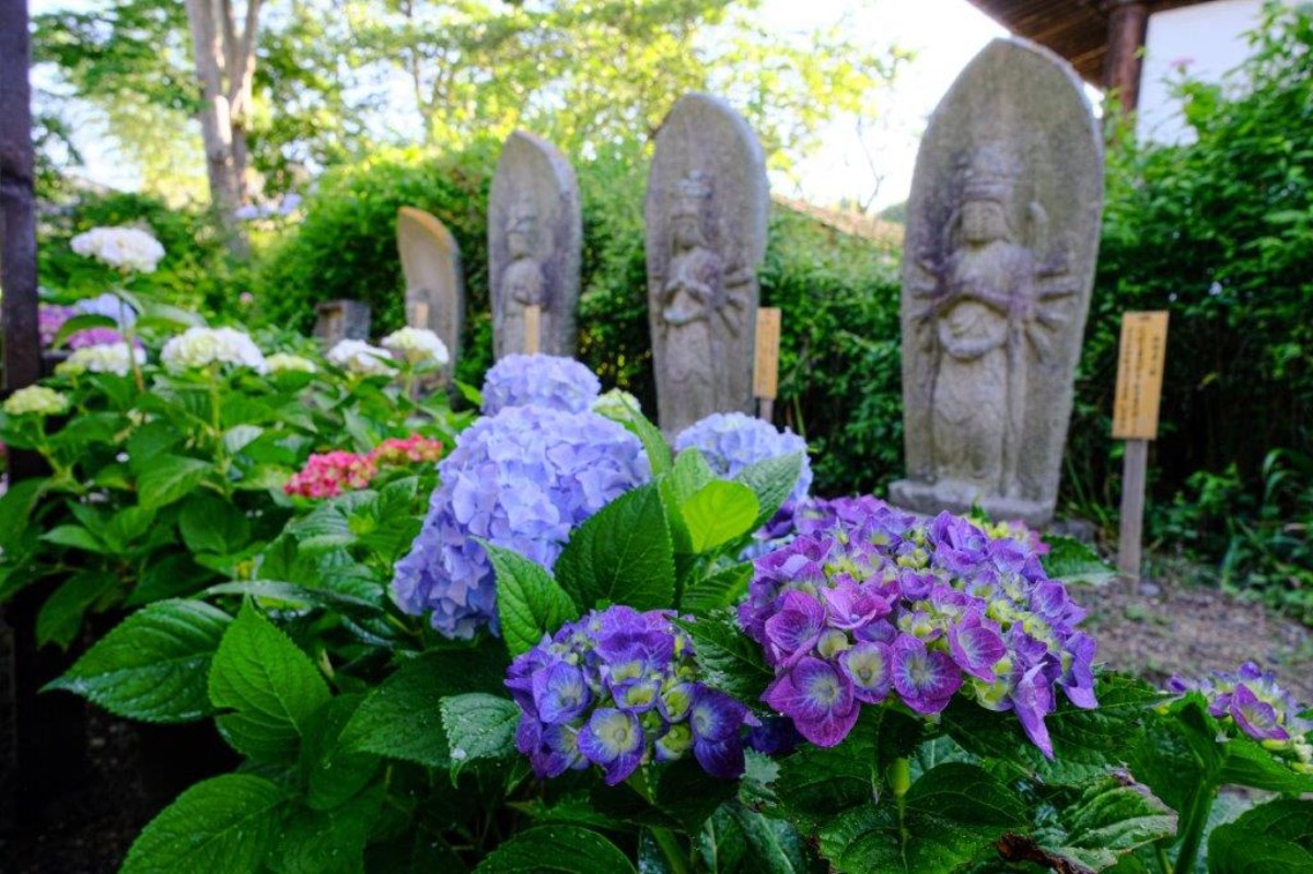 華やかなあじさいと可憐な初夏コスモスが十三重石宝塔や石仏群を彩るさまは見ているだけで華やいだ気持ちに。