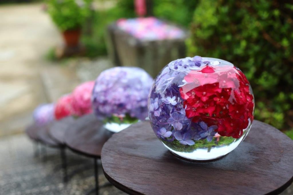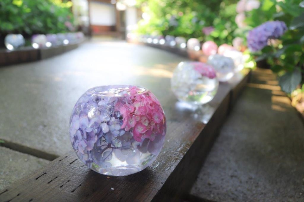 球体のガラスの器に色とりどりのあじさいを入れたアジサイガラスボールは、般若寺が発祥。