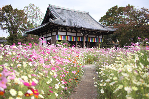 コスモス以外にも彼岸花や秋海棠(しゅうかいどう)、シオンや返り咲きの山吹など多種類の花を見ることができる般若寺は、秋のおでかけにぴったりのスポット。