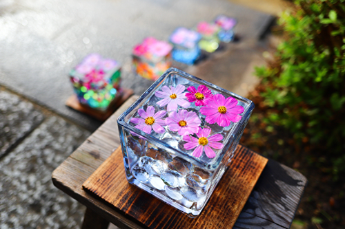 ガラスの四角い器に、水に浮かべたコスモスの花のデコレーションで、まるで宝石のようです。