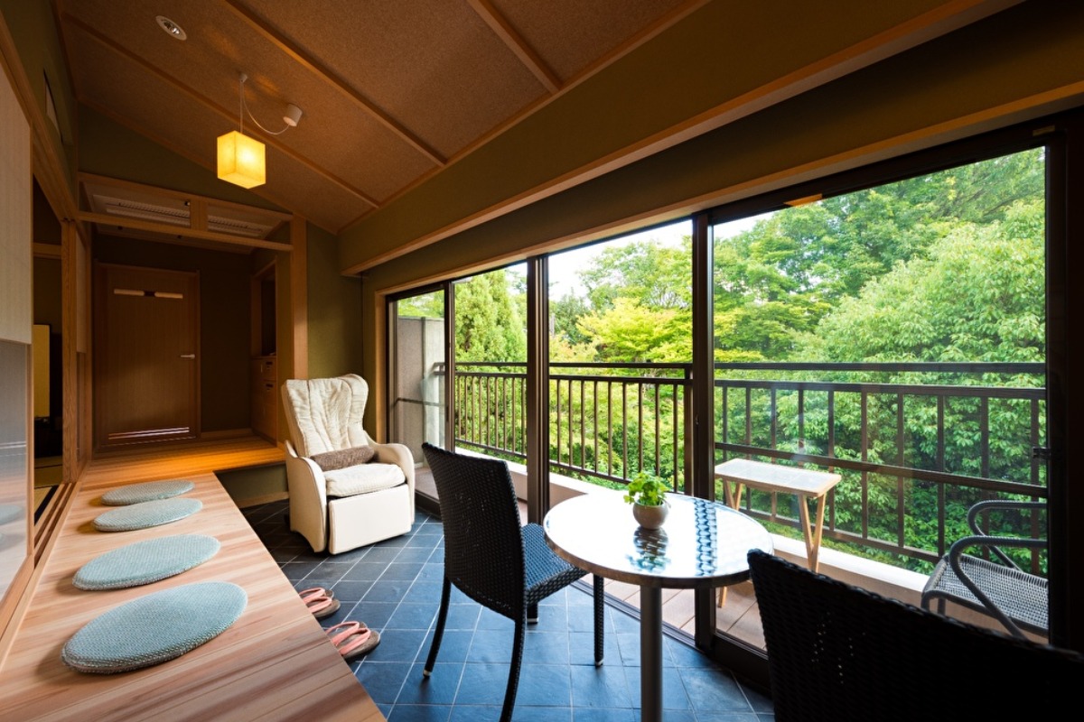中でもおすすめは禁煙特別室和洋室。ベッドルームからは窓越しに隣接する興福寺中金堂や五重塔が眺められ、奈良の風情が感じられる。また、室内縁側もあり、窓を開け自然の風を感じながらのんびりと過ごす時間は格別。