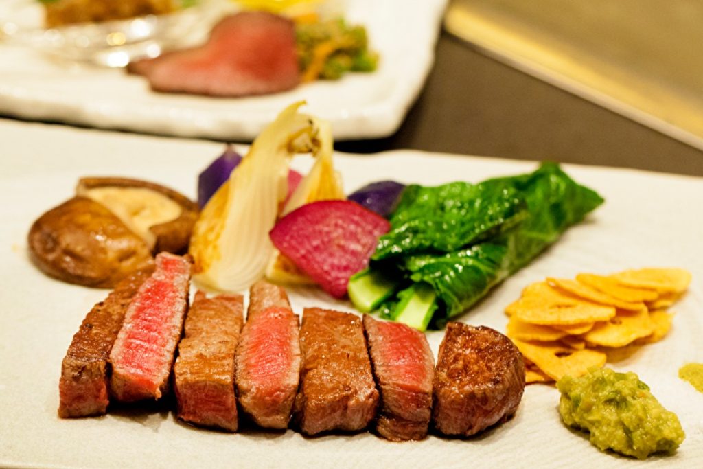 『鉄板焼山河』では、霜降りと赤みの絶妙なバランスと豊潤な味わいがたまらない高級黒毛和牛"山形牛"がいただける。奈良を感じられる大和野菜もうれしい。熟練のシェフが目の前で焼き上げてくれるライブダイニングは五感を刺激されて満足度アップ。