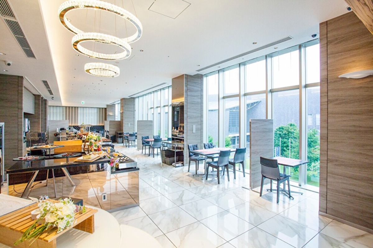 『レストランLa Festa』は床から天井までのガラス窓で明るい光がふりそそぐ、スタイリッシュなレストラン。和洋だけでない料理をビュッフェ形式で堪能できる。ビュッフェは小鉢を取るスタイルで、衛生面でも安心。ビュッフェ朝食・ランチどちらも宿泊なしでも利用できる。