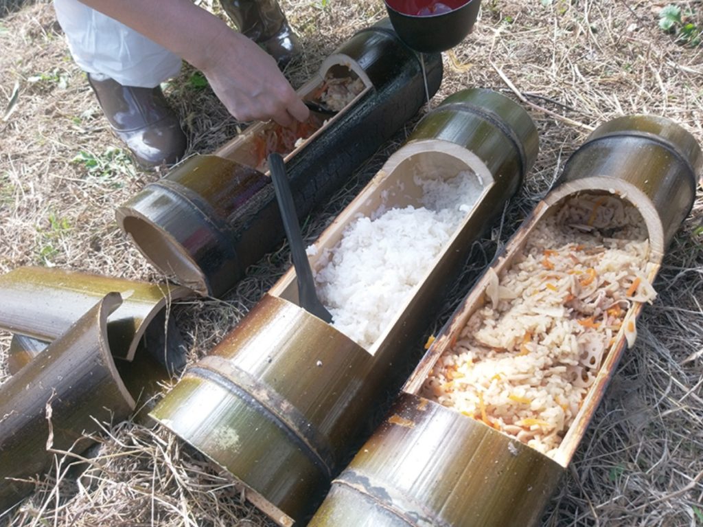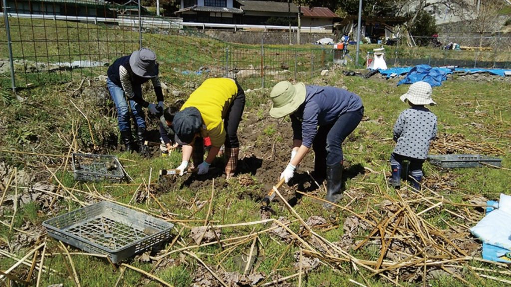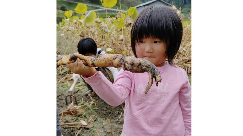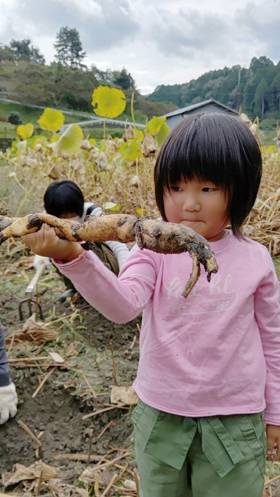 秋には水を抜いたれんこん田で、クワを使って堀り、採りたてのれんこんを使った料理を食べることができる。