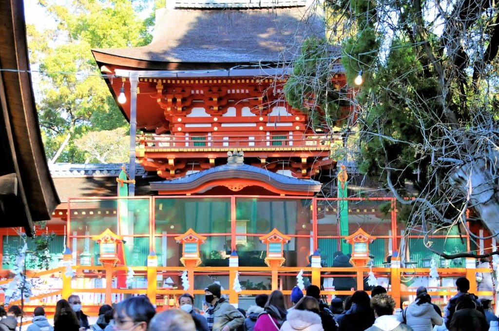 朱塗りの美しい本殿を前にすると、その神秘的で格式高い雰囲気に気持ちが引き締まる。初詣に訪れる人が多いのも納得だ。