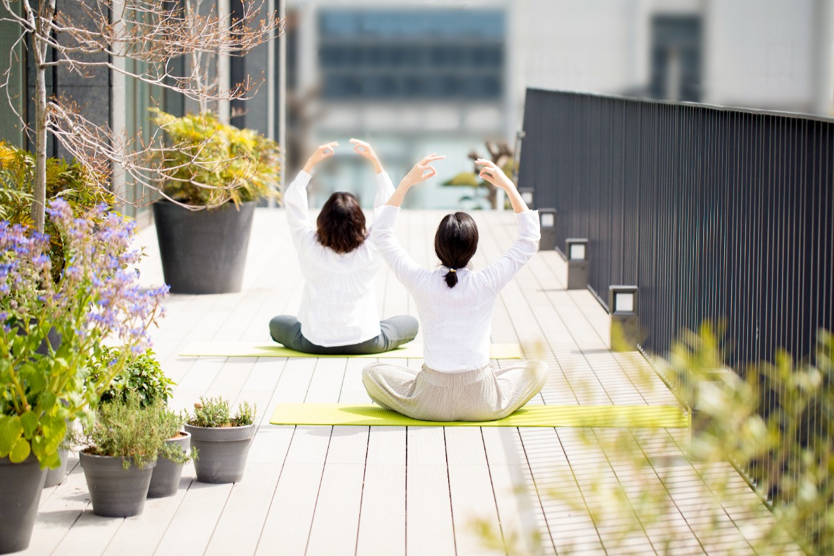 潤いと癒しをもたらしてくれるグリーンに囲まれストレッチ。