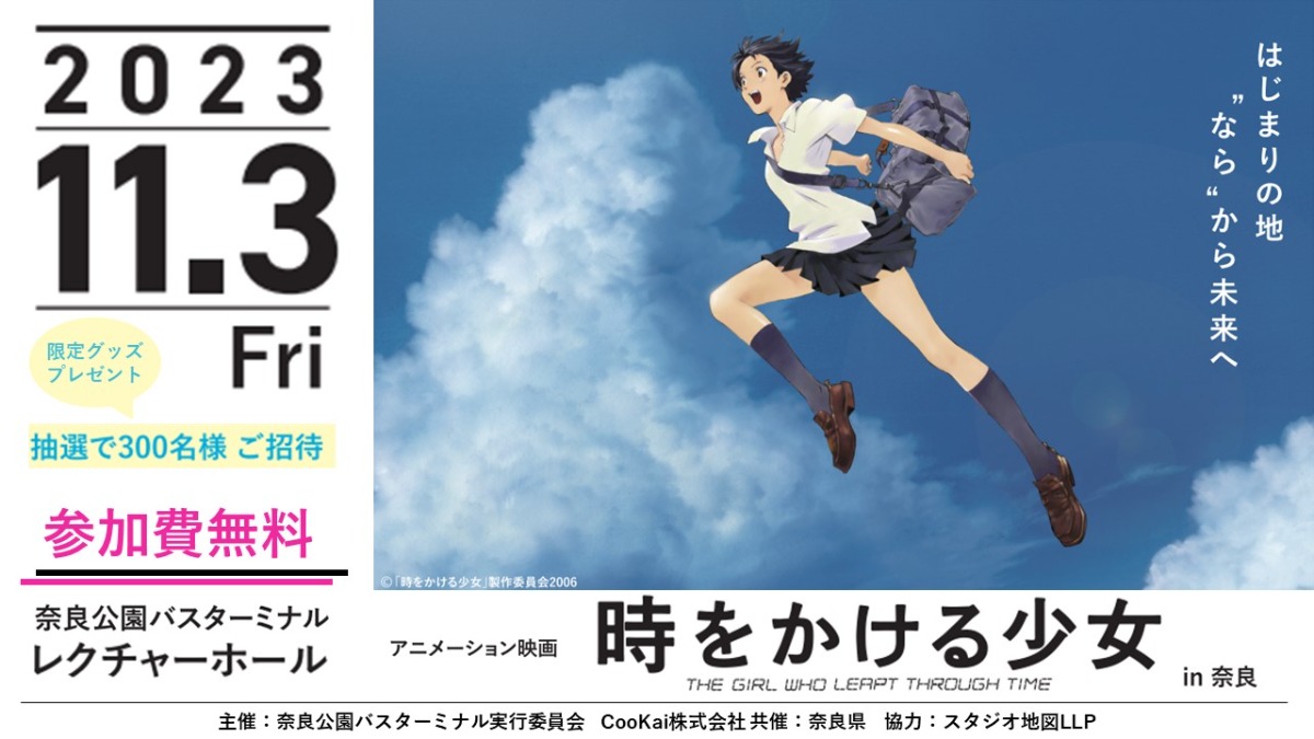 2023年11月3日(金・祝)文化の日に、近鉄奈良駅より東へ徒歩約10分の奈良公園バスターミナルにてアニメの巨匠・細田守監督の感動作「時をかける少女」の特別上映会が一日限定で開催される。