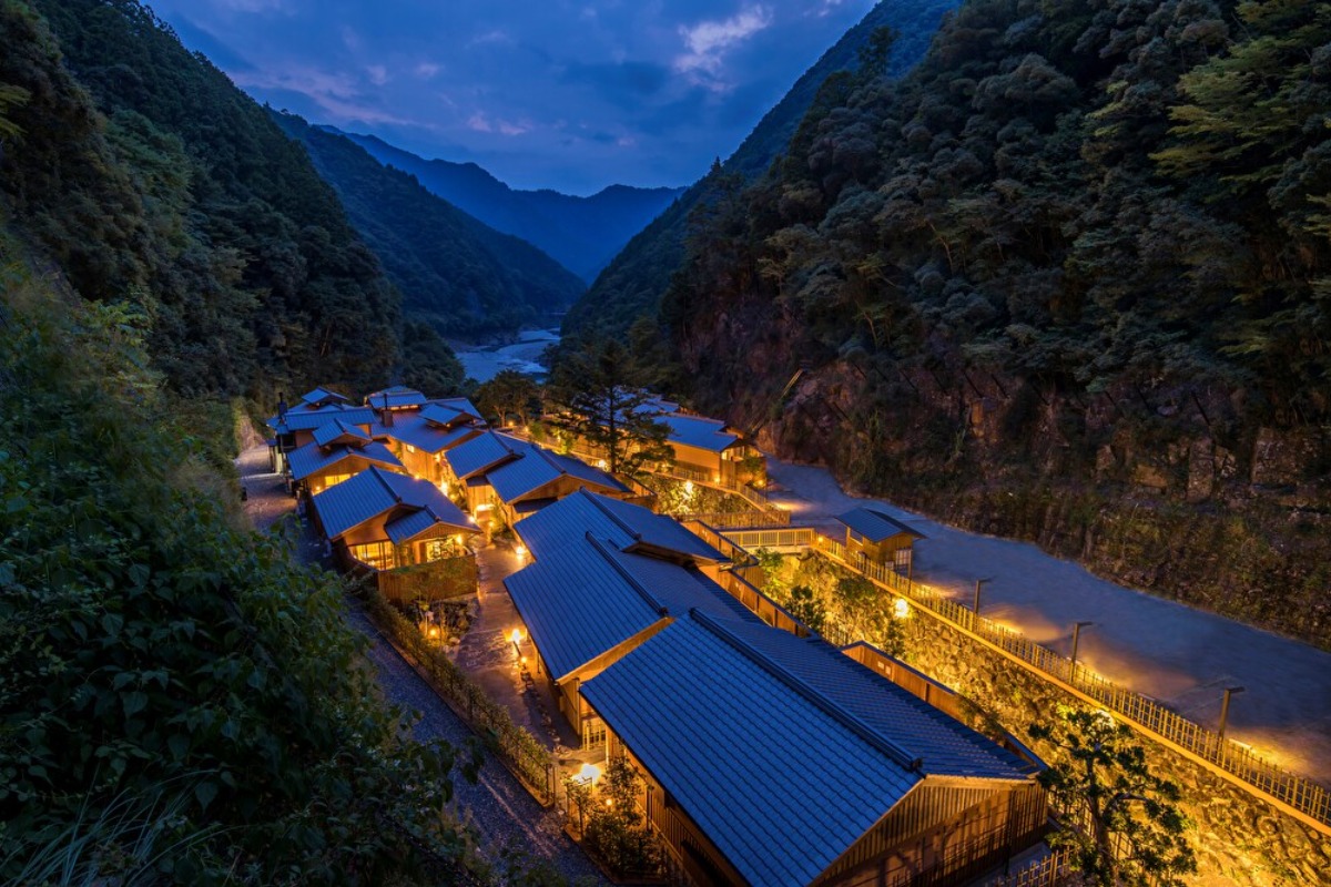 山々に囲まれ、別棟離れづくりの客室に灯りがともるさまは幻想的ですらあり、まさに秘境の宿。