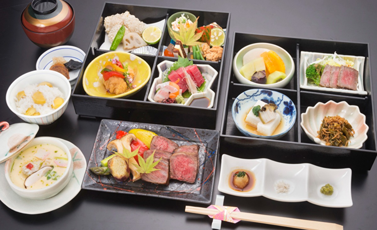 夕食のメイン料理は希少和牛の美熊野牛を使ったメニューで、種類の多さも素晴らしい。素材の味を究極まで引き出した贅沢なお弁当をゆっくり楽しもう。