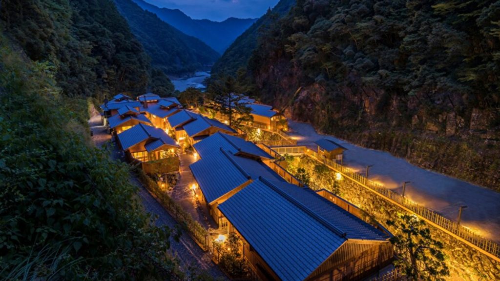 山々に囲まれ、別棟離れづくりの客室に灯りがともるさまは幻想的ですらあり、まさに秘境の宿。