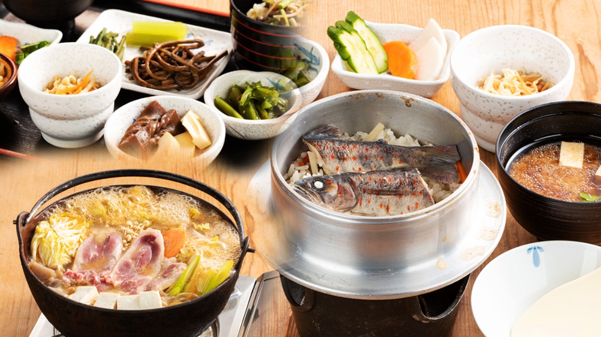大自然を眺めながら自然の恵みをいただく贅沢。新鮮な川魚や山菜、野菜などを使った季節の料理を味わおう。