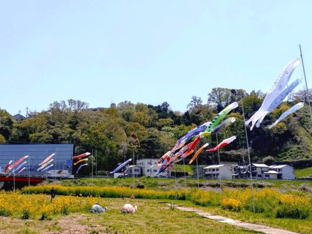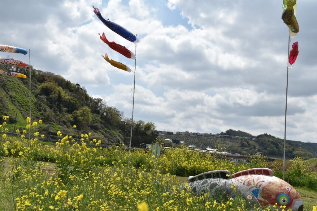 河川敷に咲く黄色い菜の花の上を鯉のぼりが泳ぐ