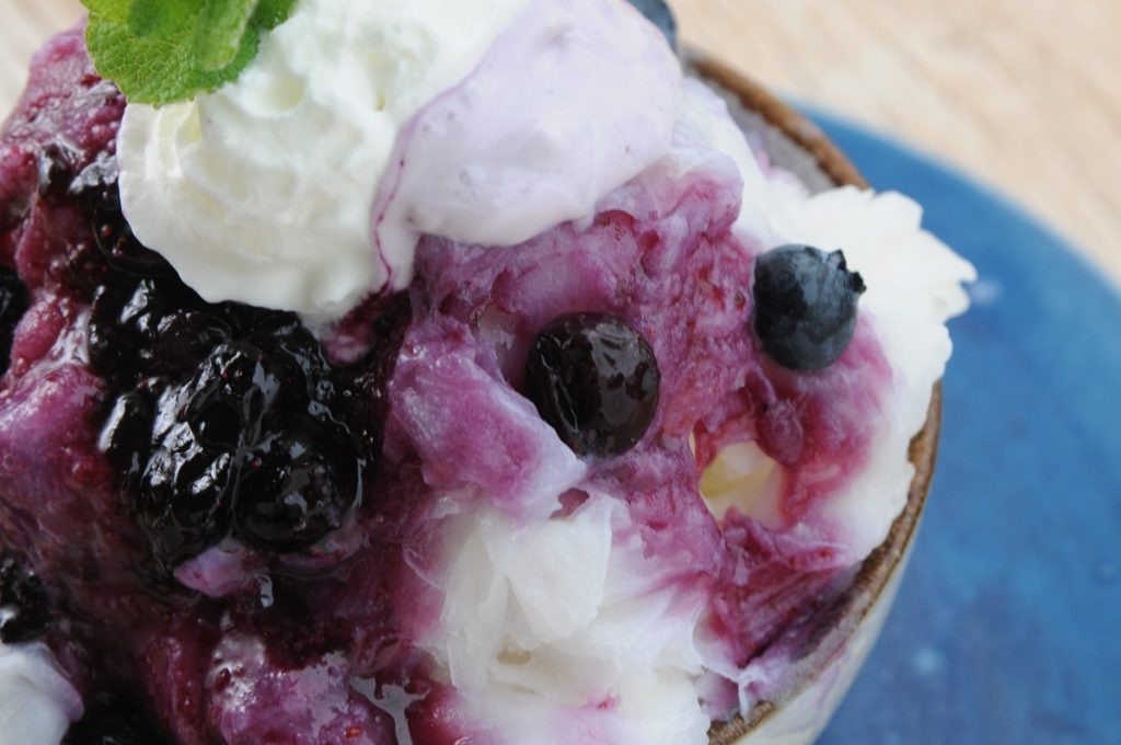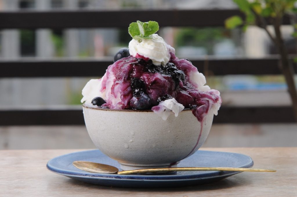 河内長野の農家から仕入れているブルーベリーを、ジャムやソースにしてミルク氷にたっぷり。