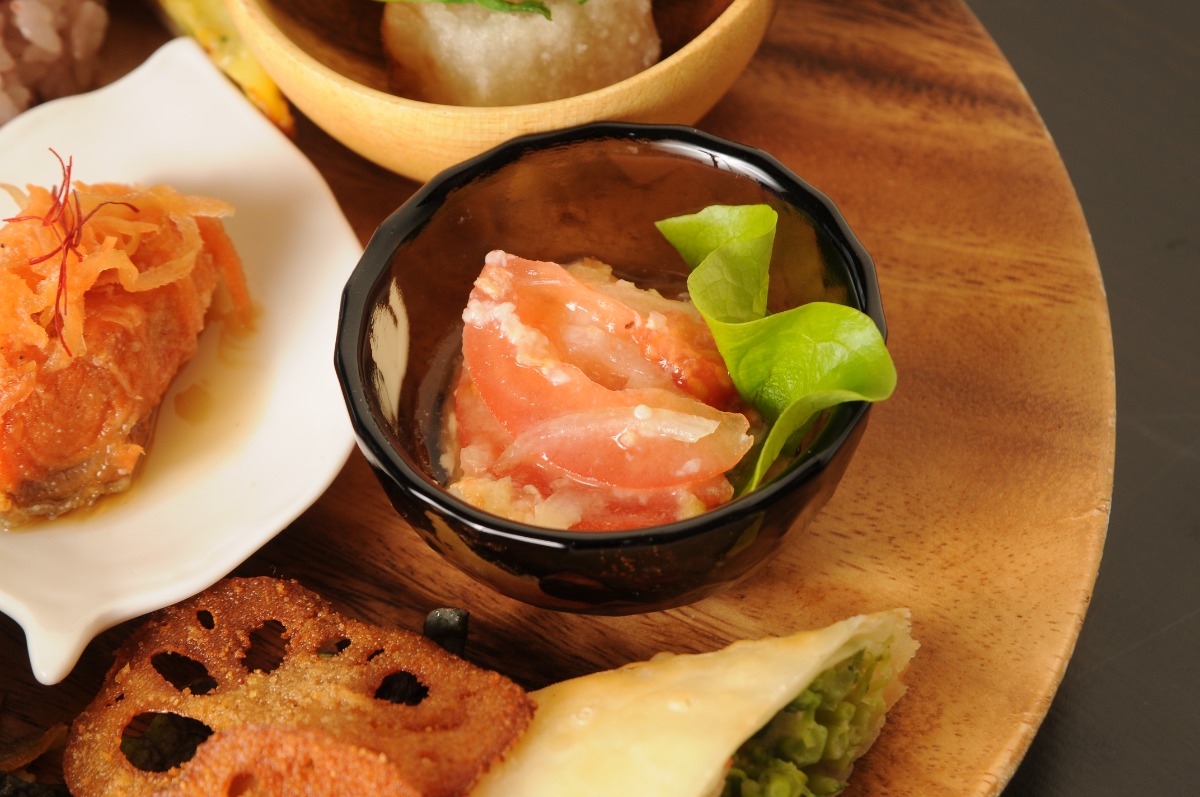 自宅で育てた野菜を中心に、8種色とりどりのメニューを楽しめる。