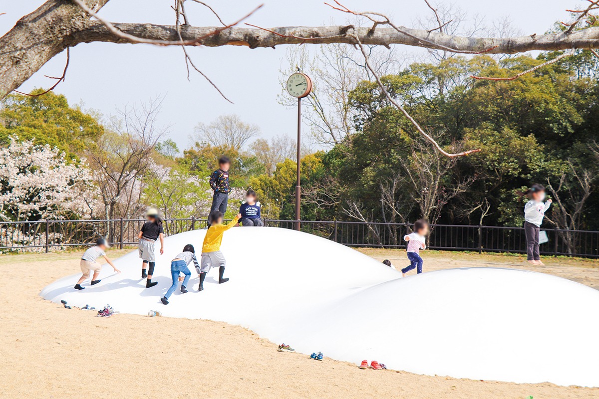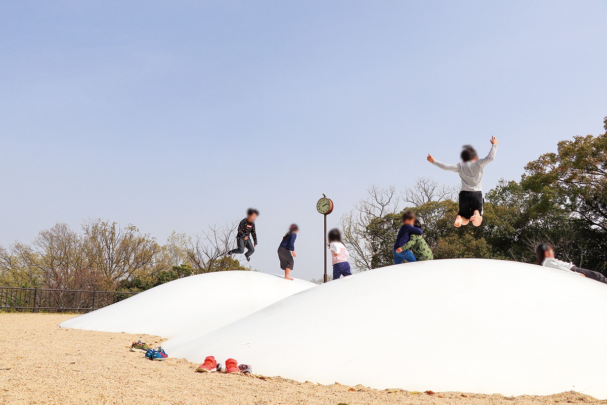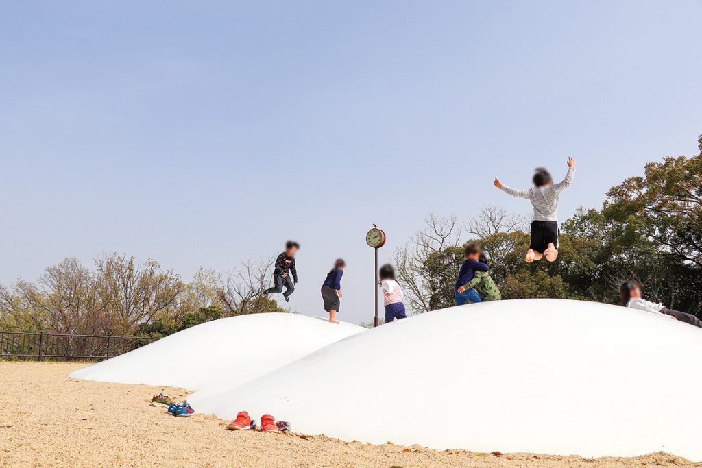 入り口からすぐ見えるのは子どもたちに大人気のふわふわドーム。ぴょんぴょん飛び跳ねたり、転がったりと子どもたちは大喜び。対象年齢は6歳から12歳なので、ちびっ子は小さなすべり台で楽しもう。隣のグラウンドには、トンネル型のすべり台がついた複合遊具もあり、飽きることなく遊べる。足上げストレッチやぶら下がりバー、のびのびサークル、ツイストボードといった健康遊具もあるので、ママやパパもリフレッシュできる。