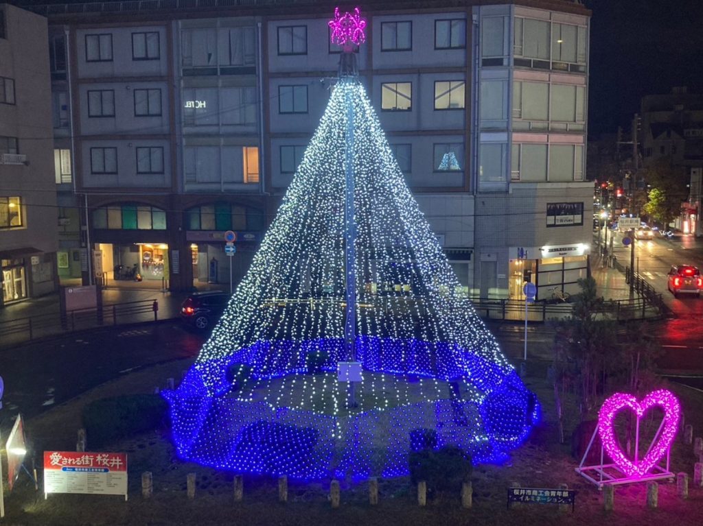 今年も桜井駅の北⼝と南⼝に設置し、LED電球それぞれ15000球を使ったイルミネーションを展開する。
