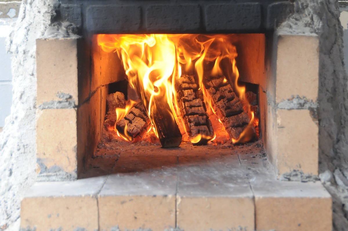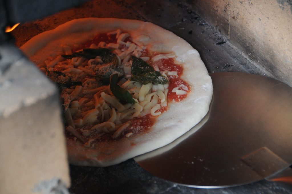 燃え盛る薪が敷き詰められた窯にピザ生地を入れて、慣れた手つきでさっと焼きあげると出来上がり。