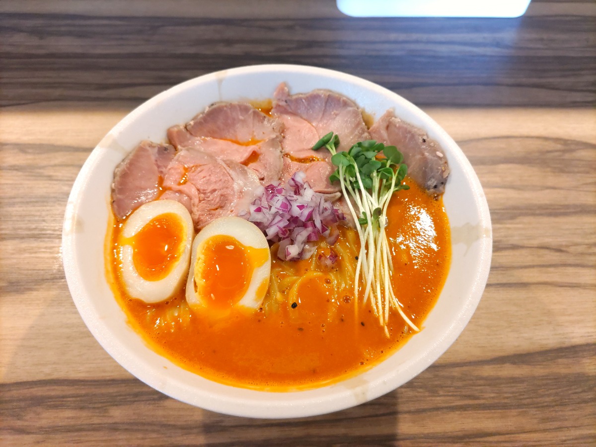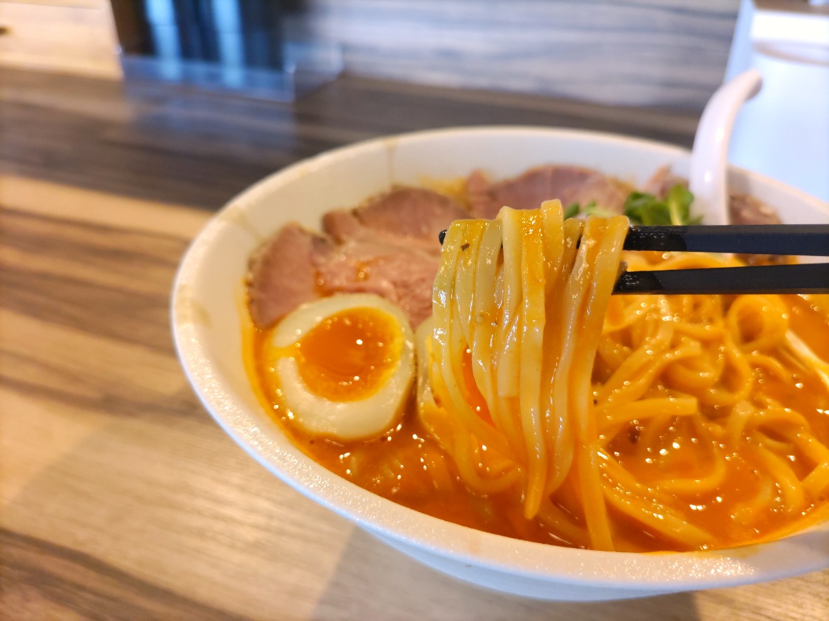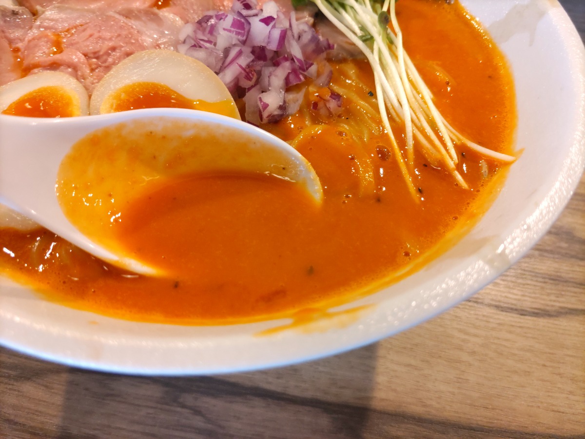 独自配合されたスパイスの辛味がアクセントになり、コクのある鶏白湯とトマトの酸味と甘味が見事にマッチしています。