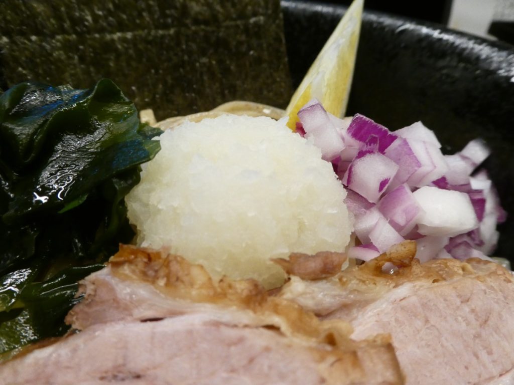 ご飯が欲しくなる仕上がりの煮豚を筆頭にワカメや紫玉ねぎが乗るトッピングの中でも、特に特徴的なのが『大根おろし』。