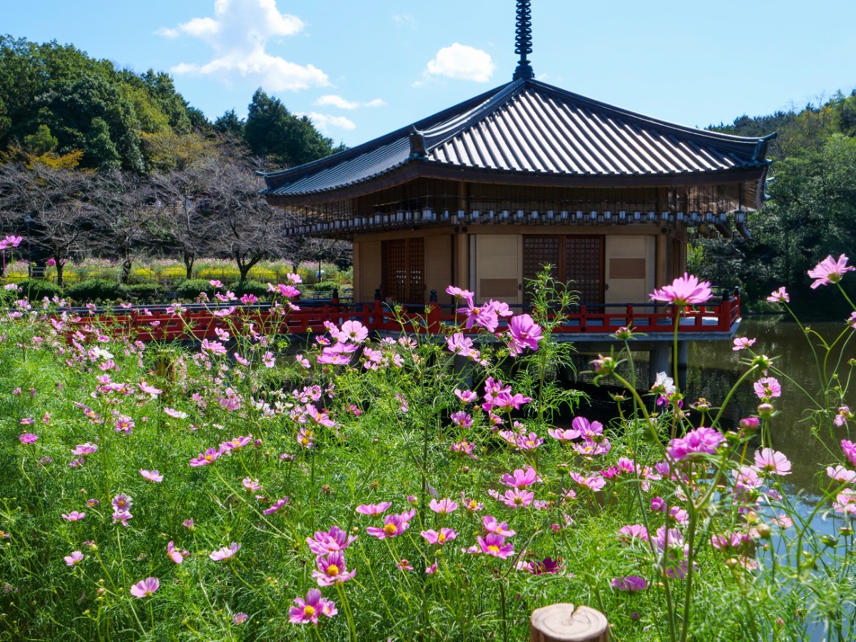 安倍文殊院のコスモスはいろんな品種があるため、早咲きから遅咲きまであり、一度に満開はないが11月初旬まで長く楽しめる(※気候により前後することもあり)。