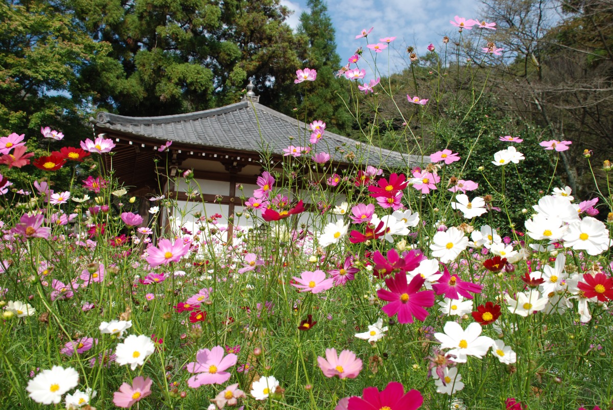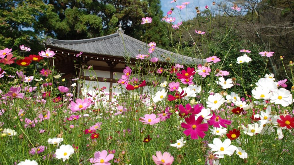 安倍文殊院のコスモスはいろんな品種があるため、早咲きから遅咲きまであり、一度に満開はないが例年10月下旬まで長く楽しめる。