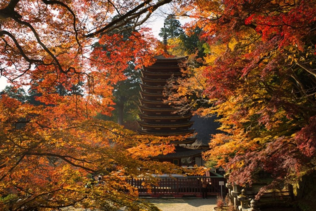 世界唯一の木造十三重塔と紅葉のコントラストは絵になる美しさで、写真スポットとしても大人気。多くの参拝者がその絶景に浸る。