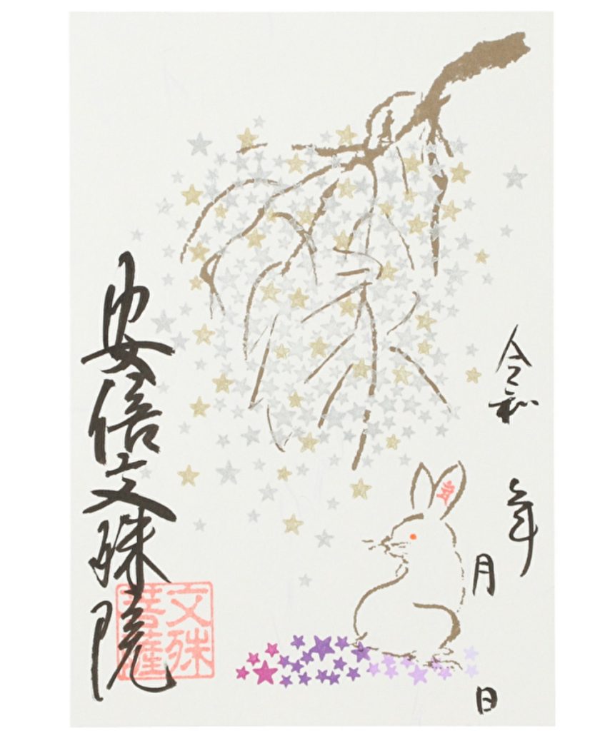 このようにうさぎと縁の深い安倍文殊院では、春夏秋冬の四季によって変化するしだれ桜、その桜を見ているうさぎが描かれた季節ごとの限定朱印があり、冬バージョンの授与期間は12月1日~2月28日。