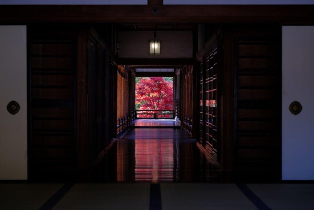 紅葉の季節も、本堂の舞台から見る紅葉に浮かぶ朱塗りの五重塔や、礼堂の床板に映る床もみじなど、見事な景観を楽しませてくれる。