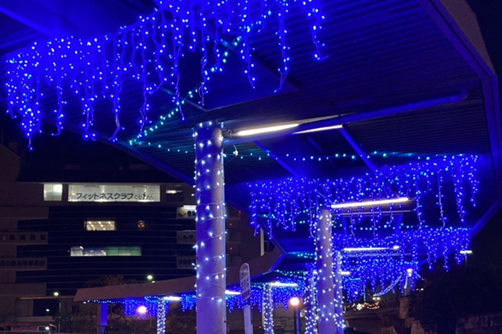 バス停もブルーのイルミネーションで幻想的に