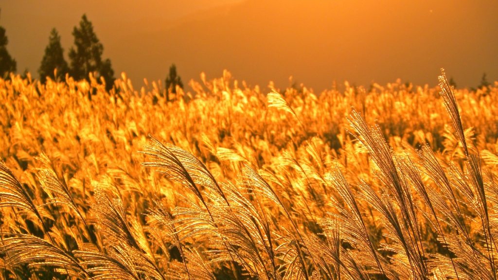 昼間、ススキの穂が陽射しを浴びて銀色・金色に輝くのも素晴らしい眺めだが、日暮れ前に夕陽を浴びて黄金色に輝くススキが一面に広がる景色は、まさに非日常の空間だ。