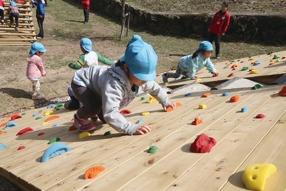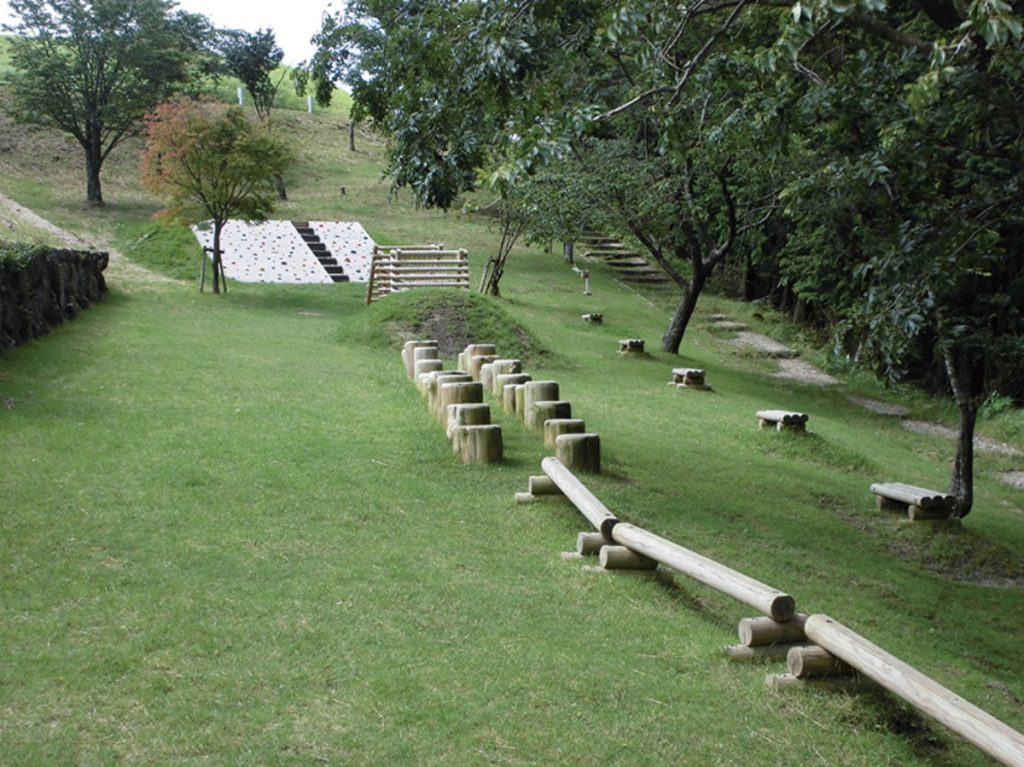 大自然の中にある「国立曽爾青少年自然の家」の幼児向けの運動遊び用アスレチック。約1.6メートルの高さがある「ウッドマウンテン」や、斜めの壁を登る「ウッドウォール」、「丸太平均台」に「丸太ステップ」、よじ登って遊ぶ築山「ゴロゴロ山」など、自然の地形を活かしたスペースで、手足や全身を使いながら楽しく運動遊びができる。
