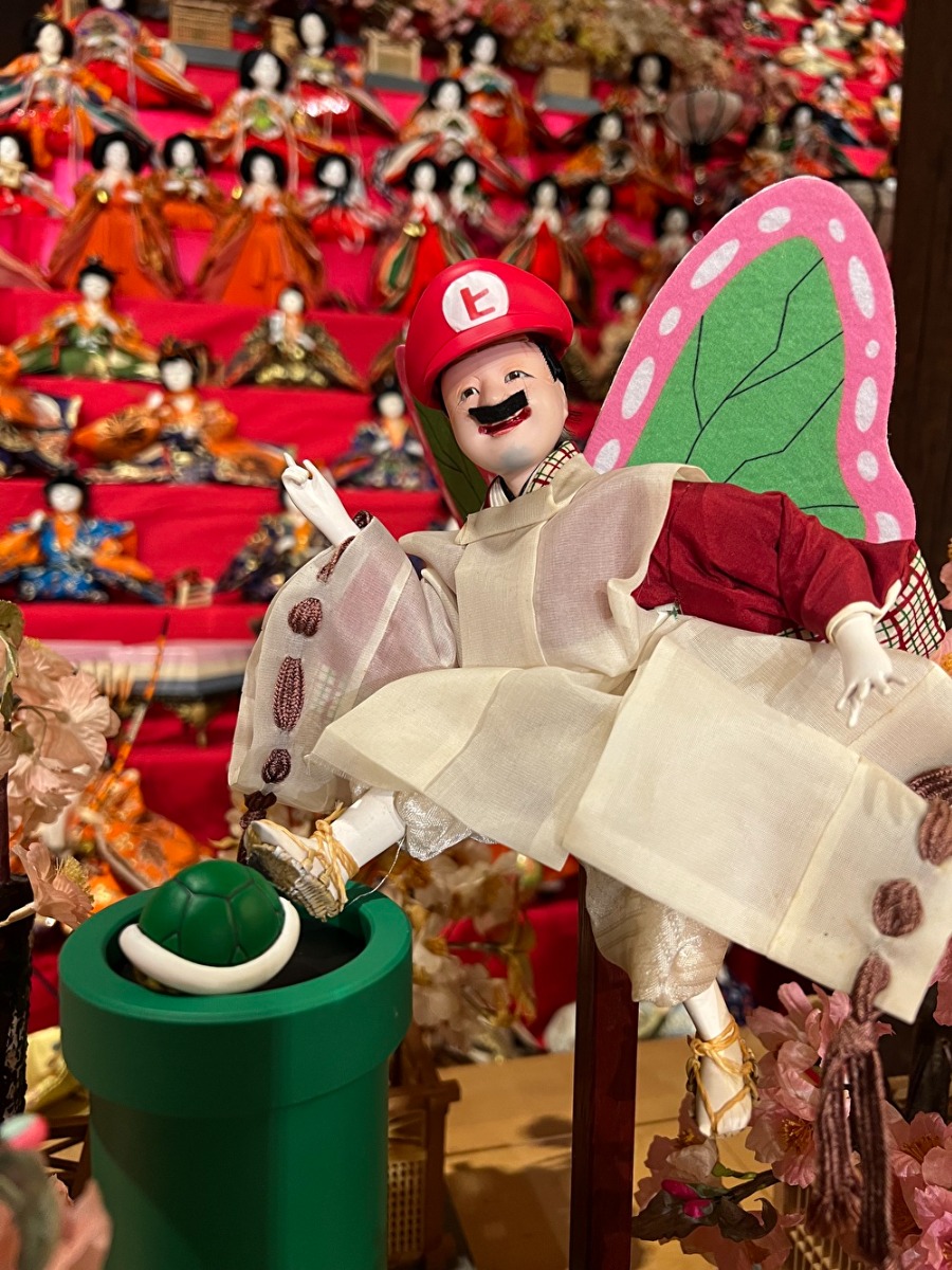 数あるおひな様の中には、2022年にプロ野球の応援パフォーマンスで大流行した「きつねダンス」を踊るおひな様や、あんぱんをおいしそうにほおばるおひな様、笛ならぬトランペットを吹くおひな様、そして超有名キャラクターを模した「スーパーヒナオ」おひな様など、ユニークなおひな様がたくさん。
