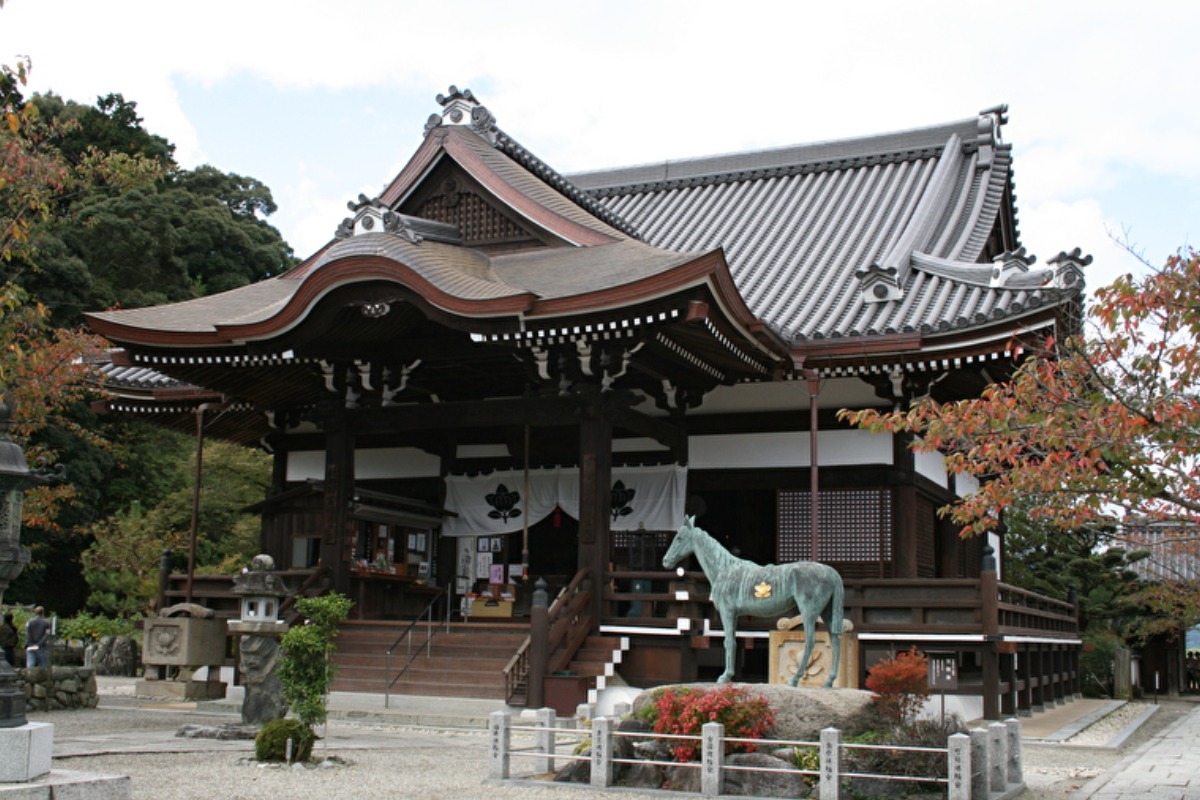 橘寺は、本堂(太子殿)のご本尊「聖徳太子座像(国重要文化財)」や善悪2つの顔が刻まれた「二面石」、往生院の天井画、本堂前の黒駒像(聖徳太子の愛馬)など、見どころがたくさん。