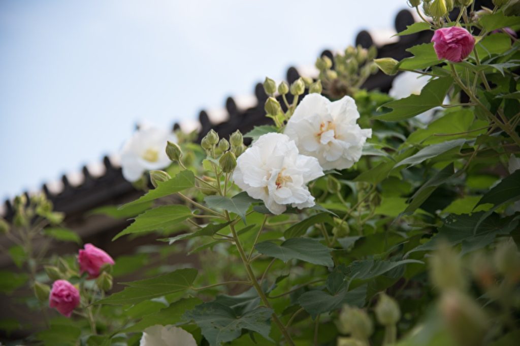 酔芙蓉は、朝白く開き、太陽の光を浴びて、時間とともに薄ピンク色、さらには濃いピンク色へと変わっていく不思議な花。一日の終わりにはショッキングピンクになって萎んでいく1日花だ。