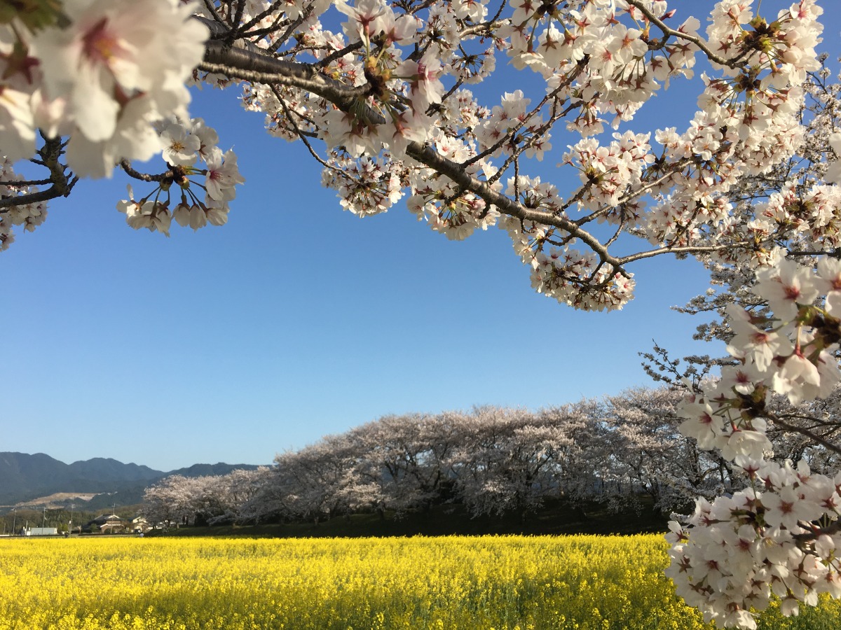 菜の花だけでも圧巻の風景ですが、タイミング良く周辺の桜とともに満開を迎えれば、さらに絶景! 一面に広がる菜の花の絨毯とそれを囲むように咲く桜、そして背後には大和三山。こんな景色、ほかにはなかなかありません。