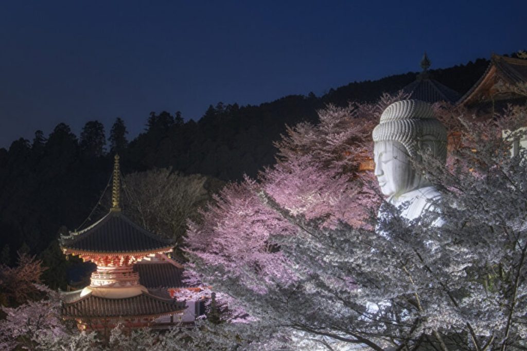 壷阪寺ではこの時期、夜桜拝観を楽しむこともできます。 境内の堂塔伽藍や大石像仏を覆いつくすように咲く桜がライトアップされ、昼間とはまた違う幻想的な美しさにうっとり。 ライトアップ期間は開花状況により変動しますが、現在のところ2022年は3月26日(土)~4月10日(日)の予定。どうしても夜桜が見たい!という方は、事前に確認しておでかけください。
