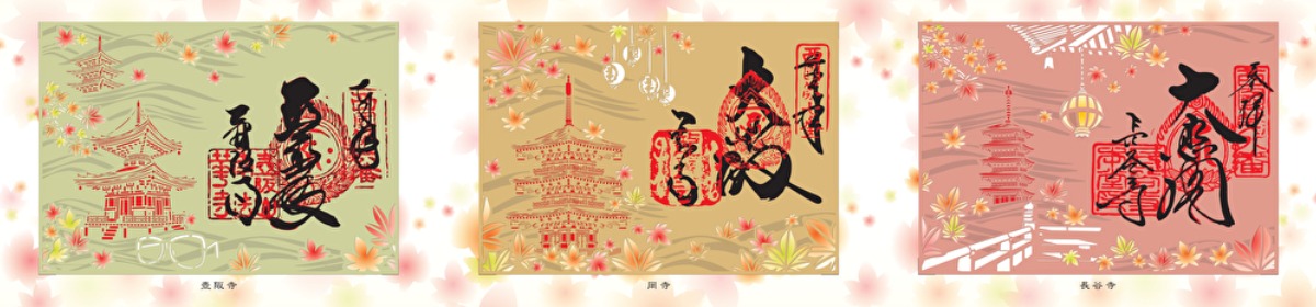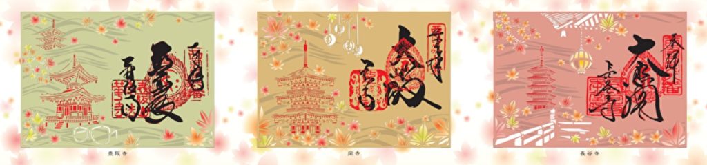 期間中は各寺特製の「もみじ回廊」の切絵朱印の授与があり、3ヶ寺の切絵朱印を納める特製台紙が販売される。特製の台紙に切絵を貼ると、宝塔が朱に染まり、紅葉が鮮やかに色づく仕掛けがあるのでお楽しみに!